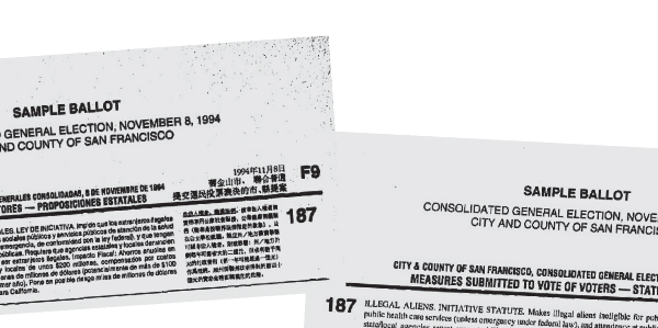 Prop. 187 passes with nearly 59 percent of the vote. Some 75 percent of Latinos voters reject the amendment. A majority of African American and Asian American voters also vote “no”. However, non-minority voters favor the amendment by 75 percent.