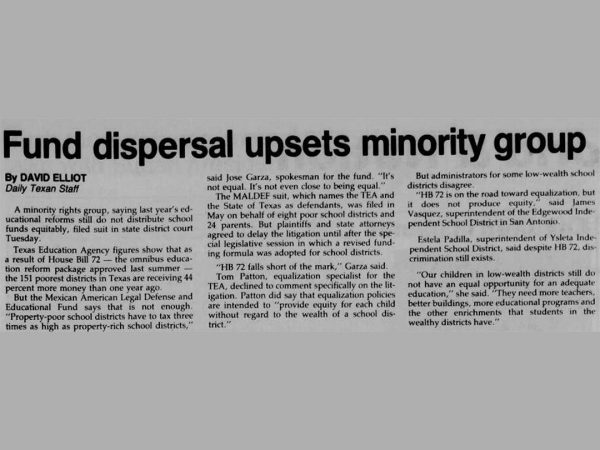 In 1984, Texas lawmakers passed a school-funding bill increasing state aid to poor schools by several hundred million dollars a year. But critics saw that bill (HB 72) as insufficient to keep up with the glaring discrepancies in per-pupil spending between rich and poor districts because it didn’t change the basic funding formula.  Nearly a year after filing Edgewood, MALDEF amended its complaint to challenge HB 72 as “intolerably illegal.”