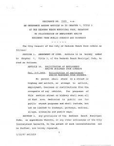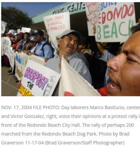 The Redondo Beach City Council passes the first ordinance in Southern California to ban anyone from standing on the street or sidewalk to solicit employment. Two years later the ordinance is updated to include drivers who stop or park to hire a person soliciting work. -