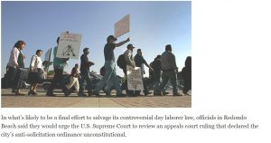 Redondo Beach, after 17 years of lax enforcement of its anti-solicitation ordinance, starts a month-long crackdown resulting in the arrest of more than 63 day laborers. -